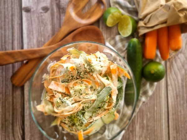 Die Zutaten für das Dressing zusammenrühren und die Gurken-und Karottenstreifen unterheben. Eine halbe Stunde ziehen lassen und mit Meersalz und Regenbogen Pfeffer abschmecken.